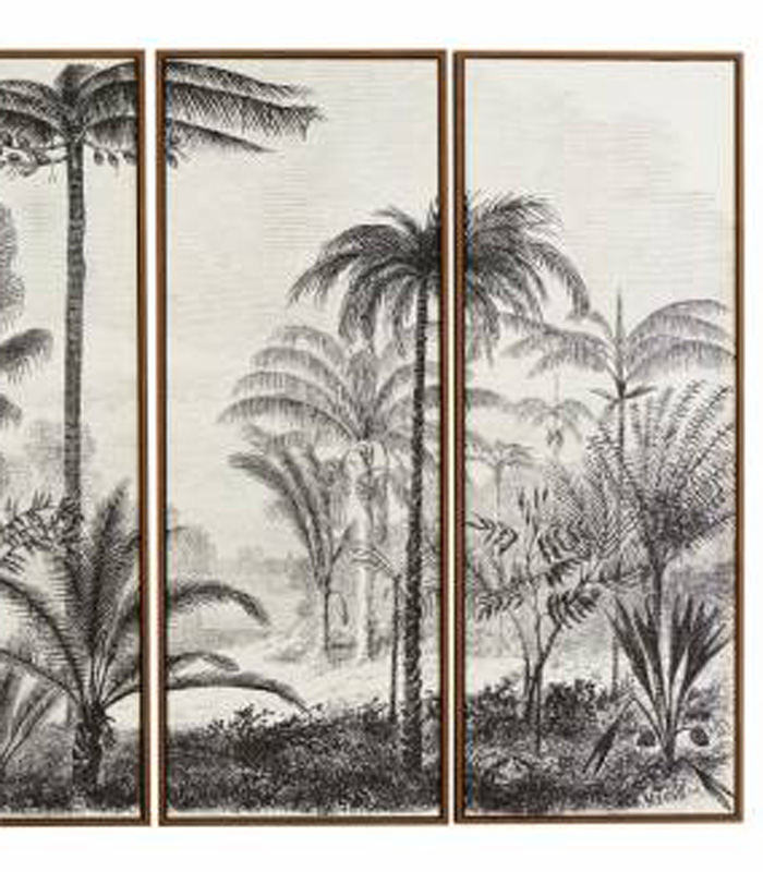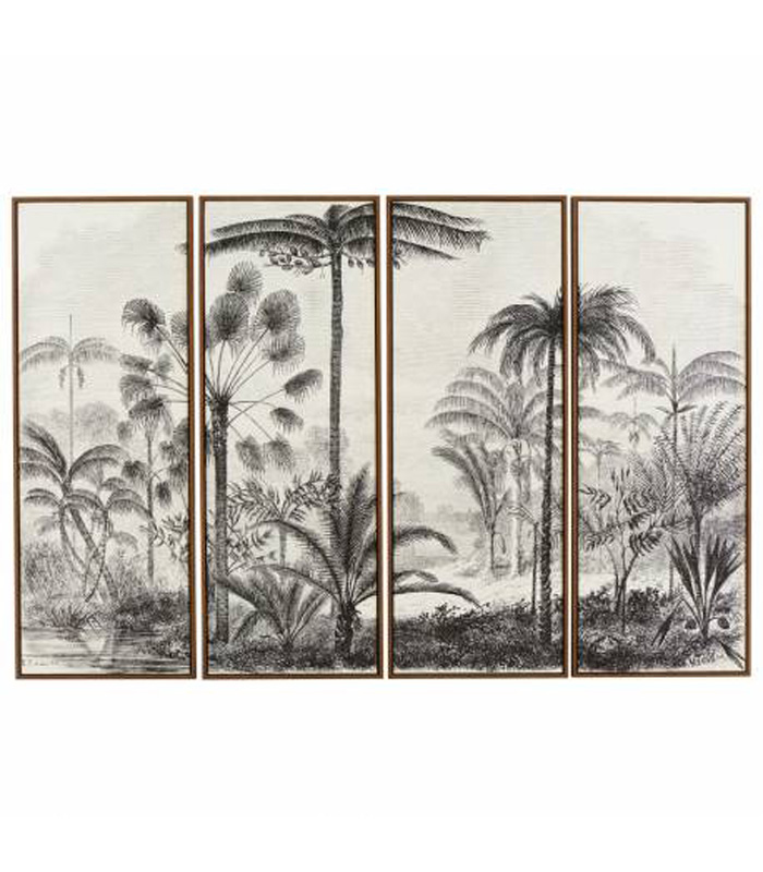 Évadez-vous grâce à ce quadriptyque de la maison Athezza. Set de 4 toiles (45×120) formant ensemble un tableau encadré de bois naturel. Impression sur toile, dans les tons noirs et blancs, représentant un magnifique paysage composé de palmiers et d’un cours d’eau.
